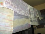 On the first evening I asked our hosts which way north was only to learn that Hawai’ians orientate themselves between makai (seaward) and mauka (mountain-ward). The parameters of my project were set that first evening as I began the task of making a map to find my own way culturally in that new environment. I learnt about local flora & fauna, topography, the vaporous atmospheric conditions, the many names for different types of rain and about certain native Hawai’ian cultural practices. I made vegetable dyes similar to those used for dyeing kapa and stained paper with them, I made monoprints and cut woodblocks that reflected the topography and printed them with watercolour on lightweight papers. I folded and stitched the prints together to form ‘maps’ in the shape of pressed hibiscus flowers.
