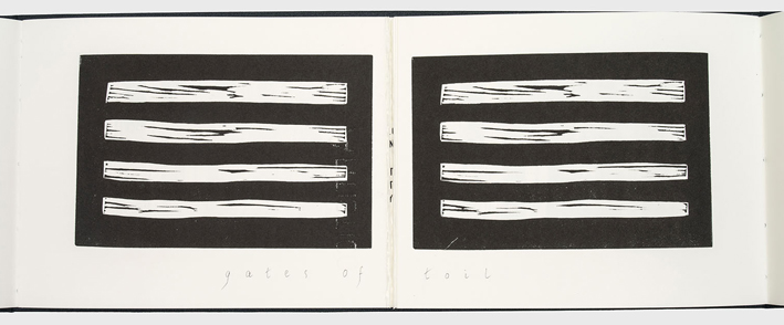 Virgil’s Keep (2017), linocut with handwritten and stamped text, 15.5 x 39.5 cm.,18 pp. (2 long, 16 short) in an edition of 6 + 2 Artist’s Proofs. Eight paired linocuts on Fabriano Artisico HP 200gsm. Green buckram cover, with gold embossed gate, double gatefold binding. Bound by master bookbinder Fred Pohlmann.