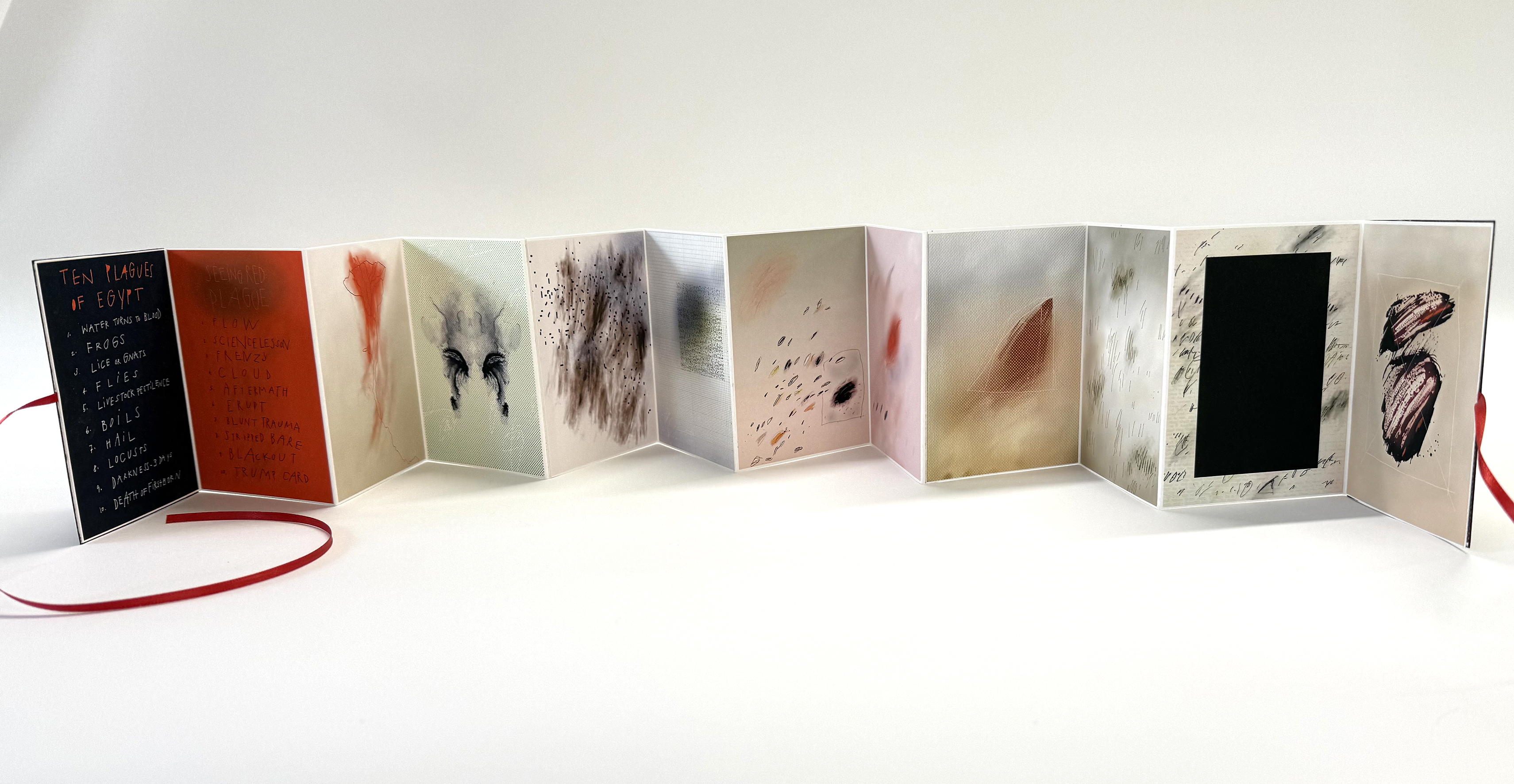 Seeing Red: PLAGUE, 2025, digital print concertina book, 10 x 7.3 x 1 cm, edition 20, price $95.