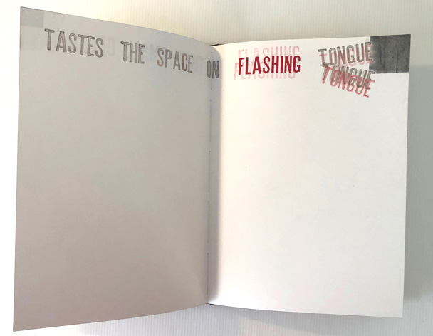 Serpent’s Ascent (2020), stamping, graphite, on Lana 180 gms hot pressed paper, 30 x 21.5 x 1.5 cm., 58 pp. One copy only. Graphite drawings interspersed with stamped text. Tan bookcloth cover, with embossed snakeskin, title in gold on black leather spine, graphite page edges. Bound by master bookbinder Fred Pohlmann.
